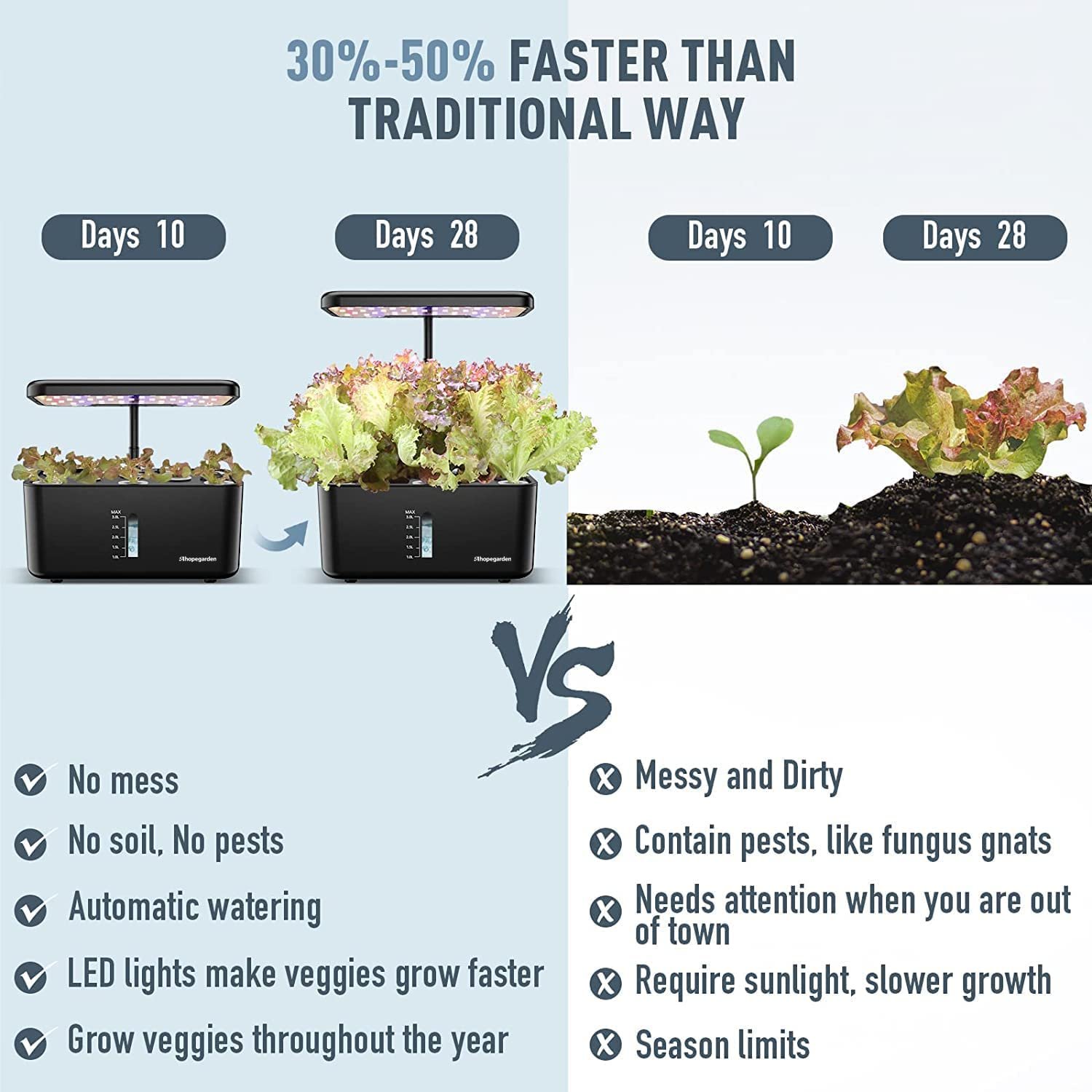 - 30% Faster than Soil Planting: Start an indoor herb garden with the Ahopegarden hydroponic growing system, which includes a water reservoir, an overhead LED grow light, and a circulation system that keeps the water fresh. The hydroponic setup and lighting systems allow plants to grow up to three times faster and healthier in controlled conditions. Simply add plant seeds, water, and nutrients to the reservoir and watch the plants grow.